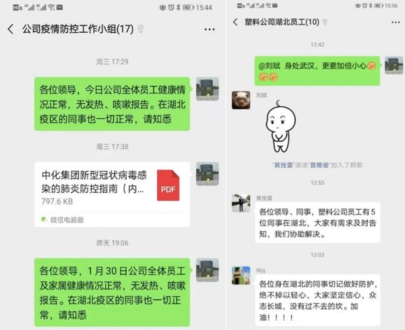 中化塑料党委发出“动员令”,各级党组织积极响应,建立微信群,启动零报告制度。党委领导分工负责,与湖北地区的员工密切联系,逐一了解情况。